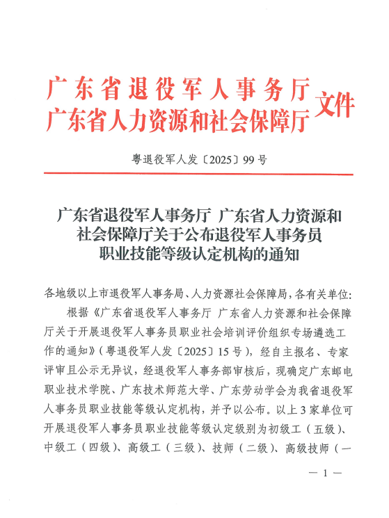广东省退役军人事务厅 广东省人力资源和社会保障厅关于公布退役军人事务员职业技能等级认定机构的通知