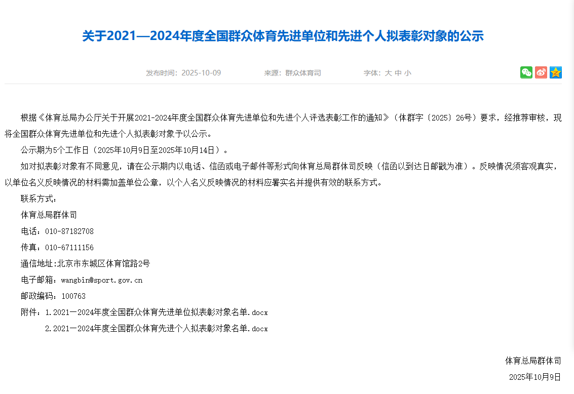 其中,pc蛋蛋(中国)开奖记录查询站5家单位获得 “2021-2024 年度全国群众体育先进单位”荣誉称号。具体名单如下: