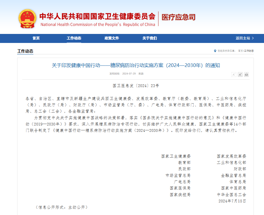 近日,为深入开展糖尿病防治专项行动,切实维护广大人民群众健康,国家卫生健康委等14个部门联合制定了《健康中国行动—糖尿病防治行动实施方案(2024—2030年)》(以下简称为《实施方案》)。
