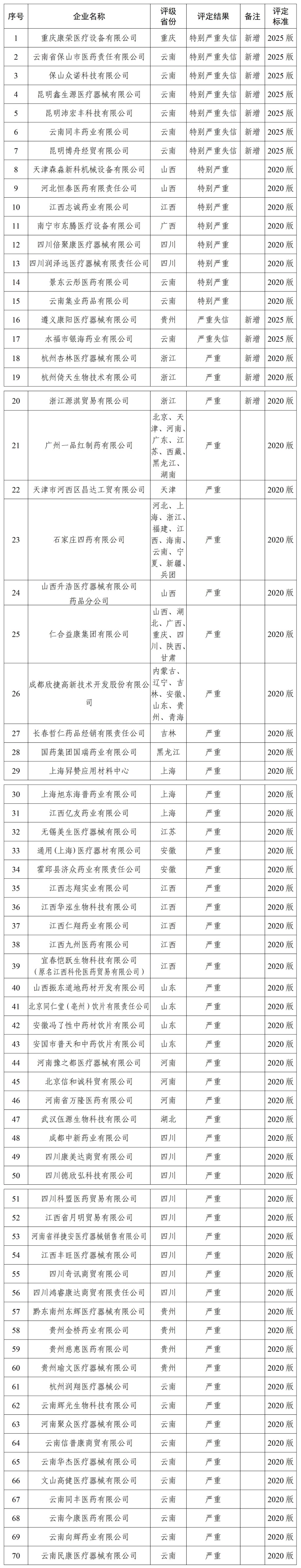 受国家医疗保障局委托,国家医疗保障局医药价格和招标采购指导中心汇总了截至2025年10月1日各省份评级为“特别严重(失信)”和“严重(失信)”的医药企业情况,现公告如下。自2025年三季度起,失信等级按照2025版裁量基准评定,此前已按2020版评定的,在其失信等级有效期内继续予以公布,直至原失信等级清零。
