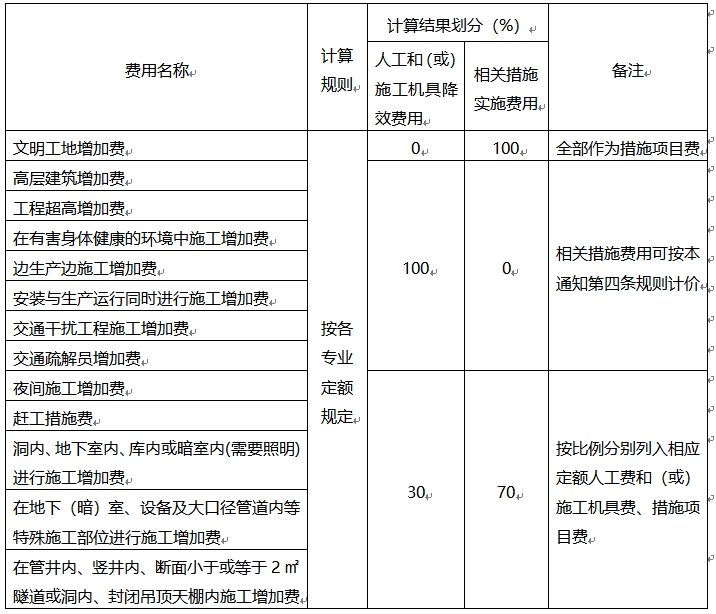 定额以费率计价的费用,主要用于人工和(或)施工机具降效费用、相关措施实施费用,相关比例划分如下表,并按以下规定执行: