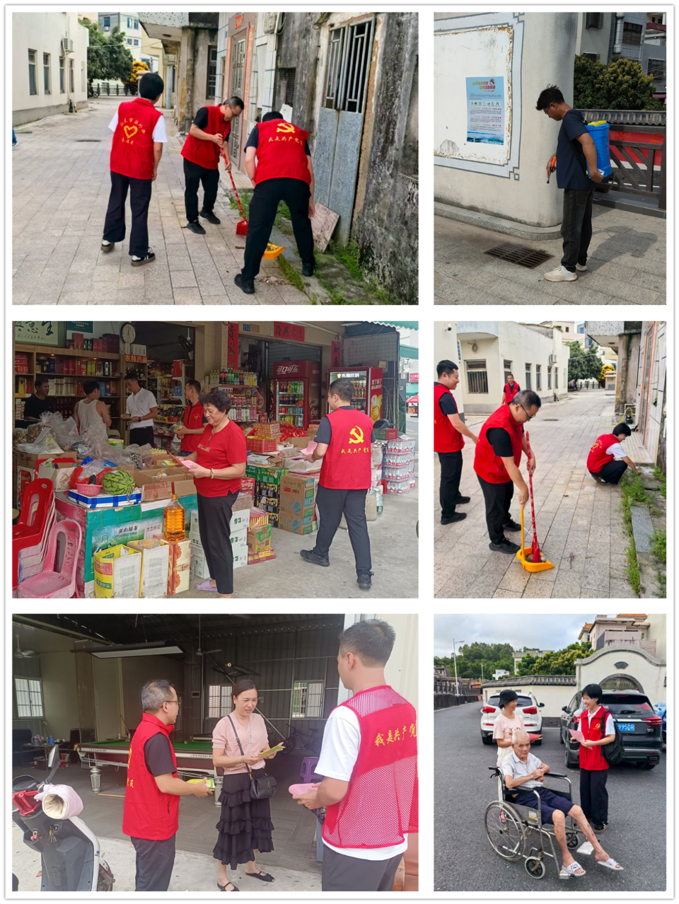 结合“入户联心”机制,党员干部深入村中开展基孔肯雅热疫情防控志愿活动。党员干部前往村民广场及村民房前屋后,集中清理卫生死角、堆积杂物和杂草,对绿化带、下水道等蚊虫易滋生藏匿的重点区域进行消杀,消除蚊虫孳生隐患;走访周边村民和商户,开展“入户联心”,派发基孔肯雅热防控宣传折页,宣传基孔肯雅热的传播途径、症状及预防知识,提醒村民做好日常防护,清理环境卫生,做到群防群控。